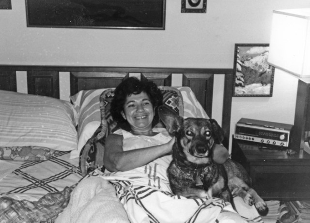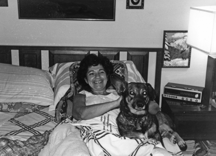 The same headboard can be seen in this picture from forty years ago of my mom and our family dog. One of my paintings is on her right. My parents decorated their coop with most of my artwork.