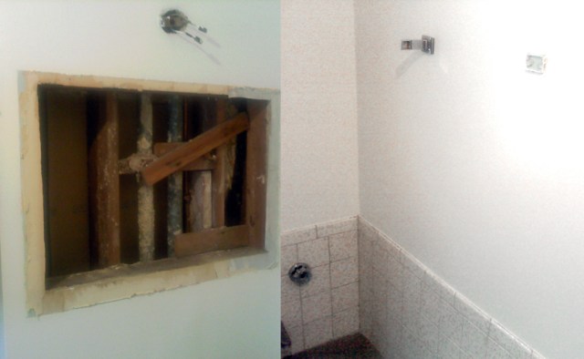 On the left, is where the medicine cabinet is supposed to go. It’s been on back order for 3 weeks. On the right, is where the towel rack fell off.