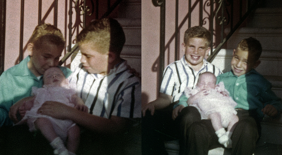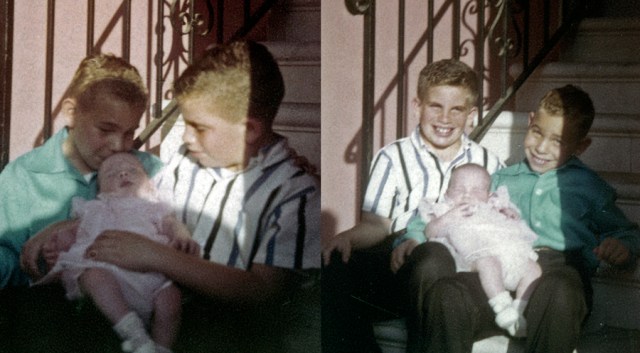 This morning I posed on the same staircase where my brothers held me over fifty years ago. Not much in the building has changed. I notice the rod-iron was more ornate in the earlier picture.