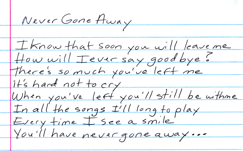 Today, I worked on an older song and it became very meaningful for me. My song is about saying goodbye and letting go. It had me thinking of you. I am going to dedicate a revised version of this song to you and Vicky. It will be called “Never Gone Away.”