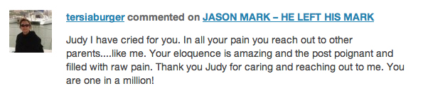 I have received a couple of very touching emails from Judy Unger. I am an avid follower of Judy’s blog, myjourneysinsight.com. I have sensed from Judy’s blogs that she has suffered deeply. I have however always avoided reading her posts on her son Jason’s death. Somehow it is too close to home.