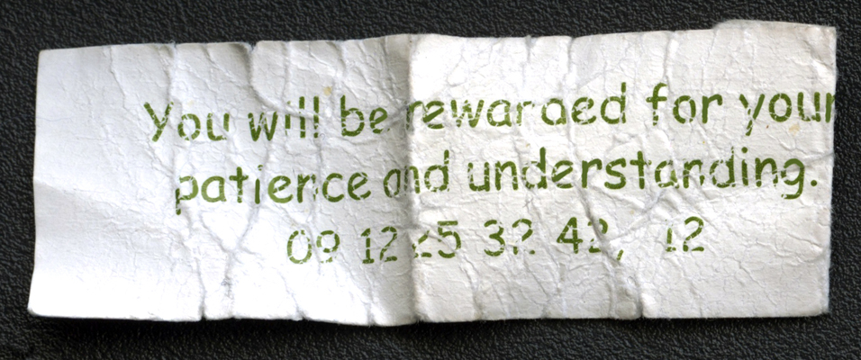 The night I decided to write this post, I found this old fortune cookie wrapper in my jacket pocket. It was definitely a sign for me since I planned to write about discovering patience in my life.