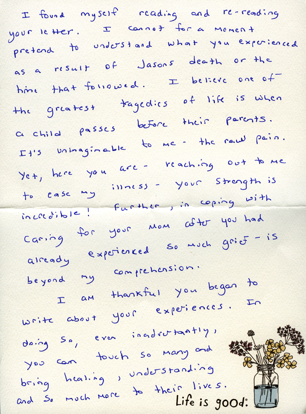 I found myself reading and re-reading your letter. I cannot for a moment pretend to understand what you experienced as a result of Jason’s death or the time that followed. I believe one of the greatest tragedies of life is when a child passes before their parents. It’s unimaginable to me – the raw pain. Yet, here you are – reaching out to me to ease my illness – your strength is incredible! Further, in coping with caring for your mom after you had already experienced so much grief – is beyond my comprehension.