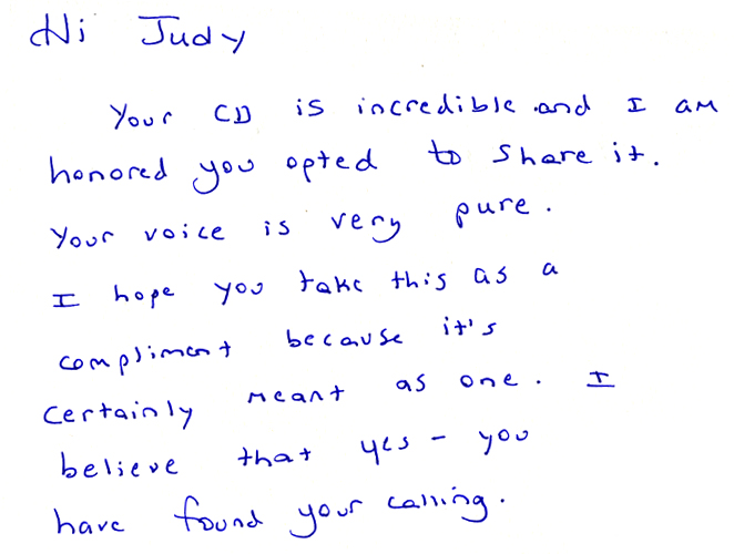 I freely share CDs of my music and stories. This lovely note came back to me from a fellow blogger in Canada. The line that gives me the most pleasure is: “Your voice is very pure.” Her letter was four pages long.