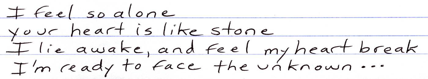 “The Unknown” changed my life. I wrote the lyrics late at night while I was on a family vacation. Before I wrote those lyrics, I had never acknowledged my true feelings before.