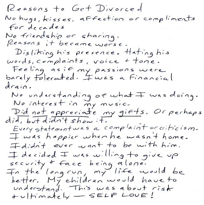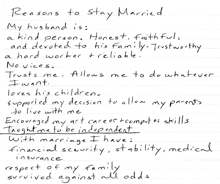 On the good list, he was very supportive of my art career, even though he was unsupportive emotionally. He’s not a bad person; just very unhappy. Even if my husband is not “affectionate,” he does go to work every day and I have a lot of freedom.