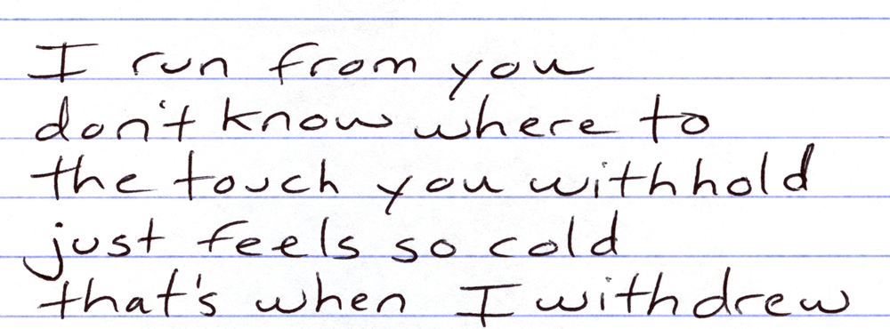 J: And it came out better that way. Actually, you don’t need to explain when your heart went cold. You can just feel cold, and that’s when you withdrew. “Your heart is like stone” is such a mean statement. I could rewrite it, “My heart feels like stone – you’re so alone!”