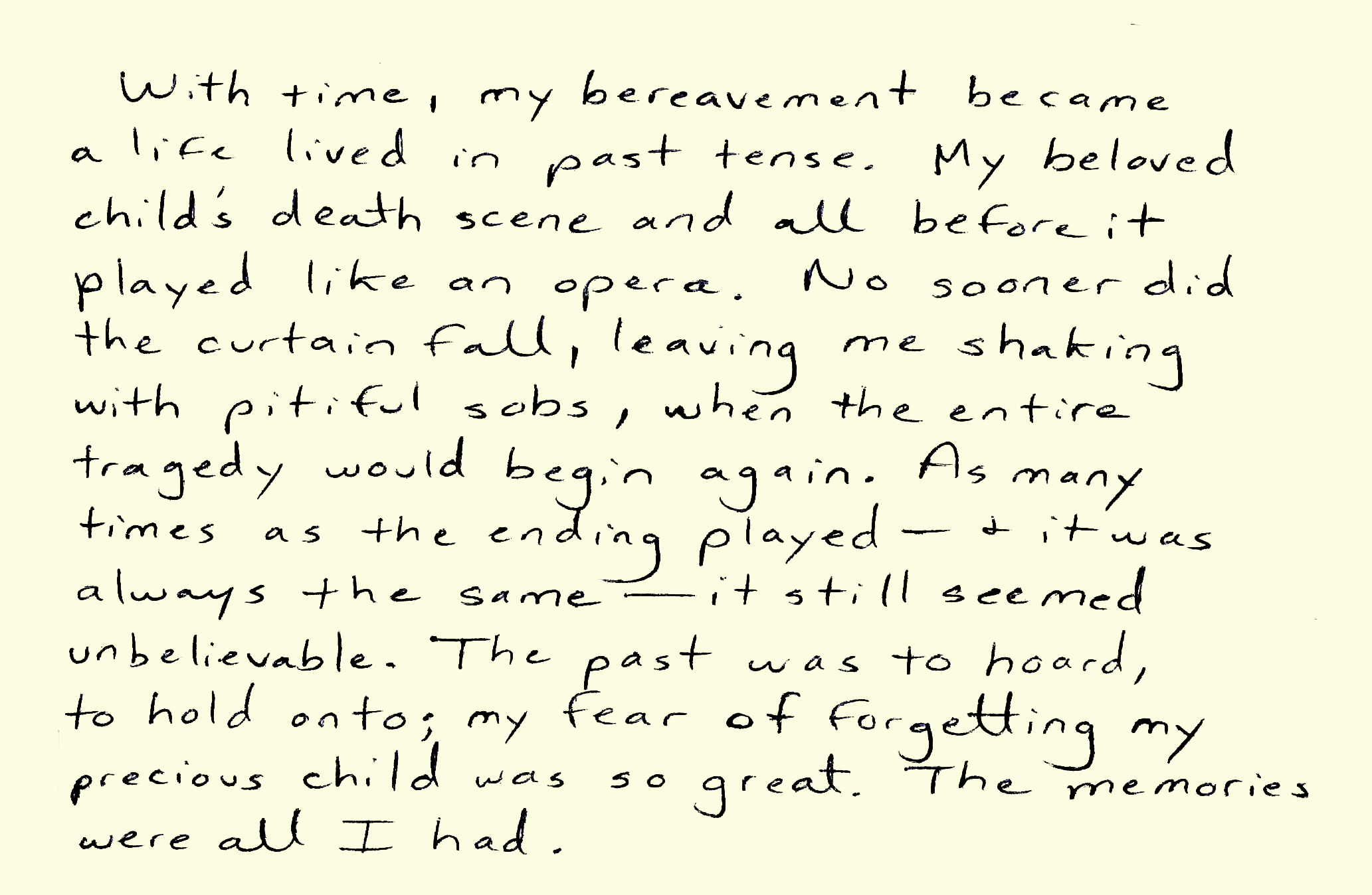 My wisdom after 20 years is that healing is possible. It is imperceptible at first and not adequate when the pain is so horrific. But it happened for me. I was blessed to find something where my son returned into my life in a beautiful way – through music. Just this past weekend, my son came into my bed at night and held me close and whispered a new song into my ear. I haven’t recorded my vocal for it yet. But the music speaks – it speaks very clearly.”