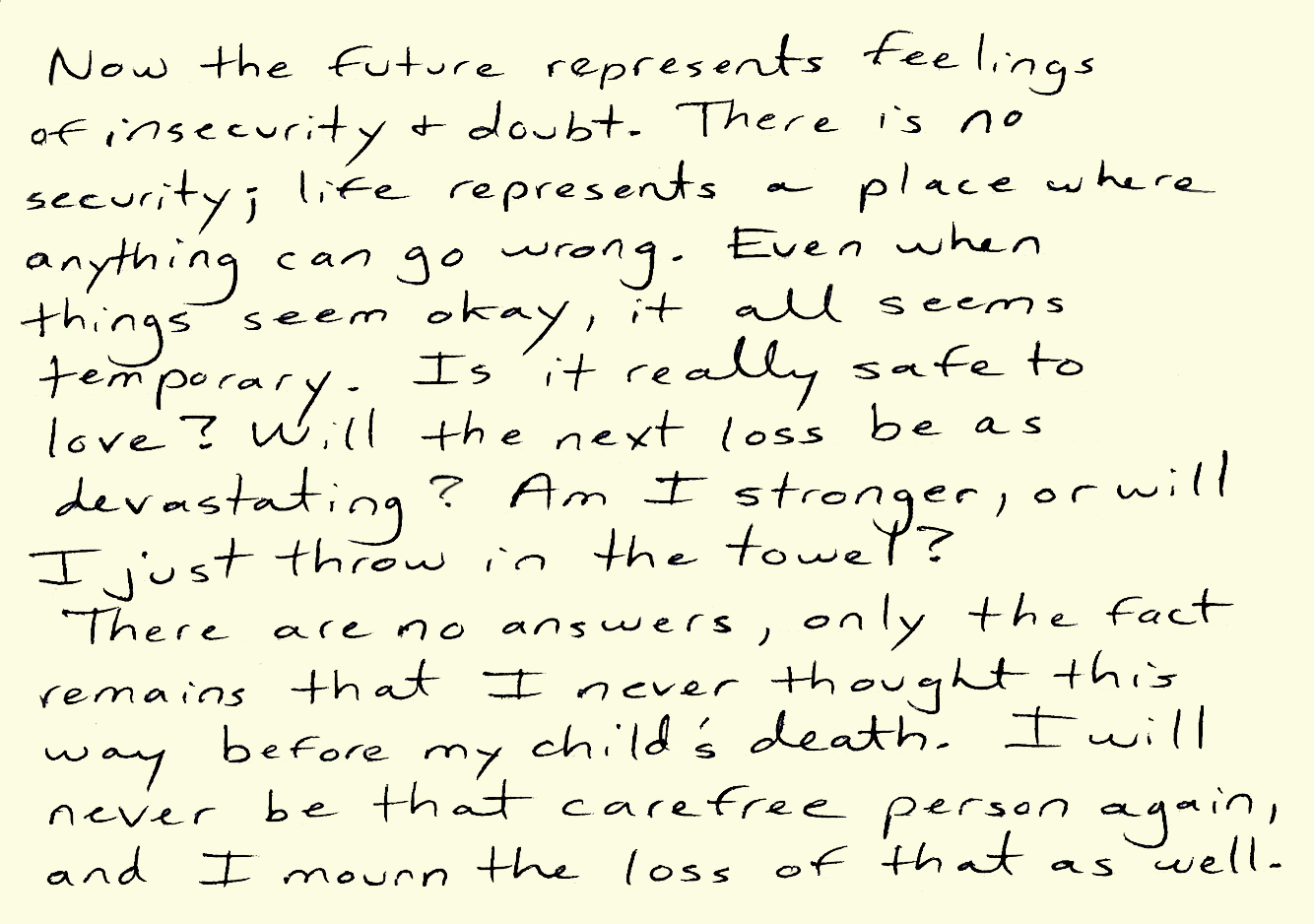 It’s hard not to feel resentment when you see the people around you enjoying the joy their children give them as they move through the milestones of life. I watch as life moves on and think about those of us that have been chosen to walk this horrendous path and try to make sense of how we have been touched with unbearable sorrow while others seem never to be touched. My faith was shattered when this happened and it remains shattered to this day.