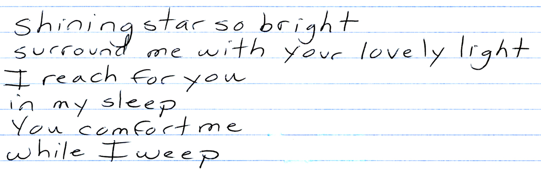 Sometimes, things are there that we cannot see. Grief is that way. Thank you for telling me that my song touched you. What you don’t know is that my song has lyrics and they are dedicated to you because when I sing them – I know they are for you. My son whispered this song to me for a reason.