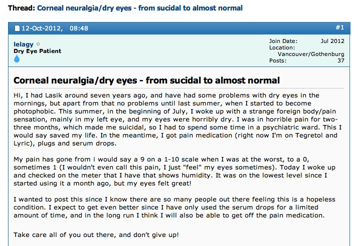 I’m thinking there is no such thing as just chronic dry eyes. I think we should tell our docs not to say, “You have chronic dry eyes and I’m giving you Restasis. Just go die for a year.” I’m glad I had the brains to go to a neuro optho on my own after 6 months.