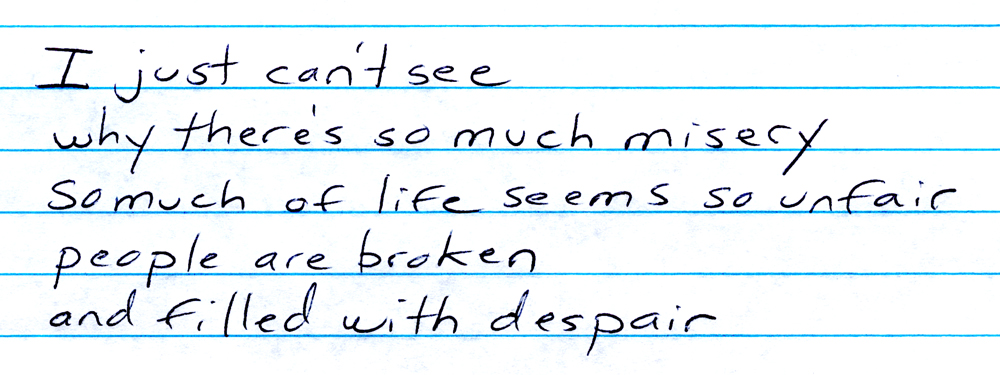 When I first began writing my song, God was only implied. On this second recording, I actually allowed myself to say the word. As I grappled with how to phrase my question about suffering, I started out with: “I try to understand why.”