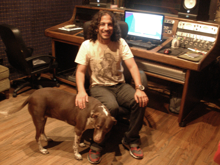 A picture of Darrin at the recording console with his dog nearby. She’s never in the room when we record, though.