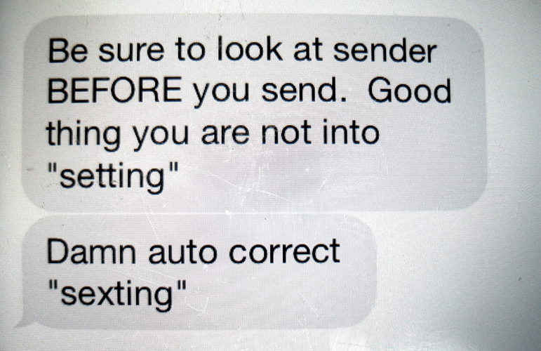 You are too funny! Be sure to look at sender BEFORE you send. Good thing you’re not into “setting.” Damn auto-correct – I meant “sexting!”