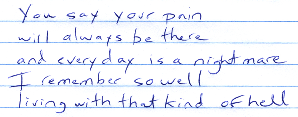 When lyrics eventually poured forth from me, at first I wasn’t sure about whether they worked. I have written many songs related to grief and find it difficult to soften my lyrics when expressing those feelings.