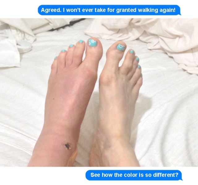 Thank you so much for asking about me, Belinda! I was actually starting to write a blog post this morning. It’s been very challenging. But I am getting there. It’s almost 2 weeks now since I was given the green light to start walking again. Lots of pain, but I’m making progress.