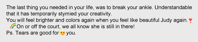 After a lot of angst, I pushed myself to text a tennis friend who lived nearby. It was late at night and I didn’t expect to hear from her. When I saw her response, I started bawling.