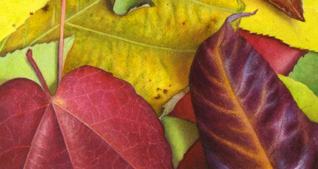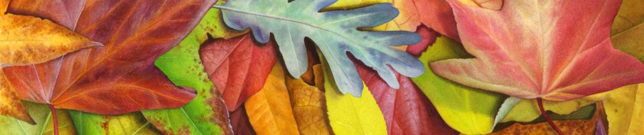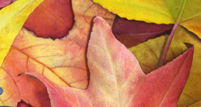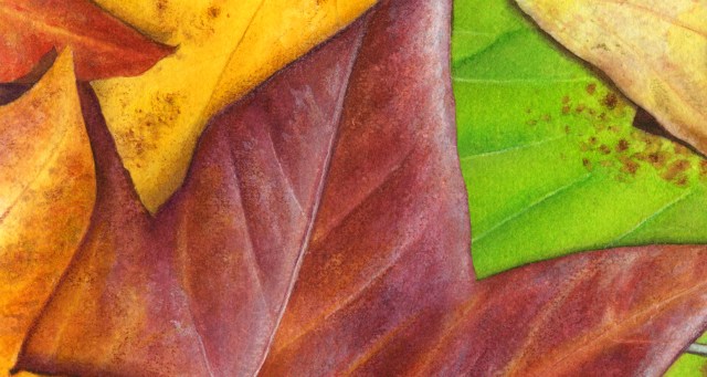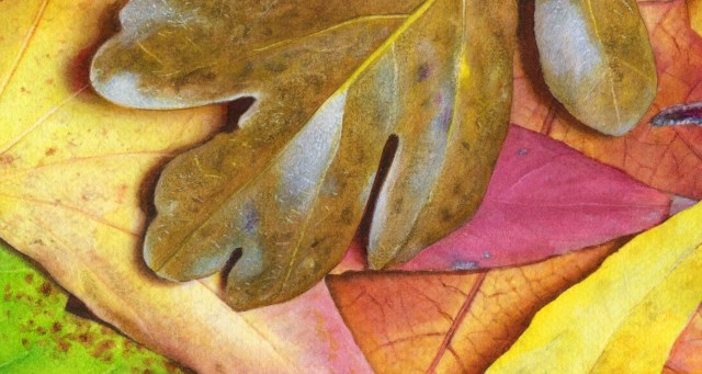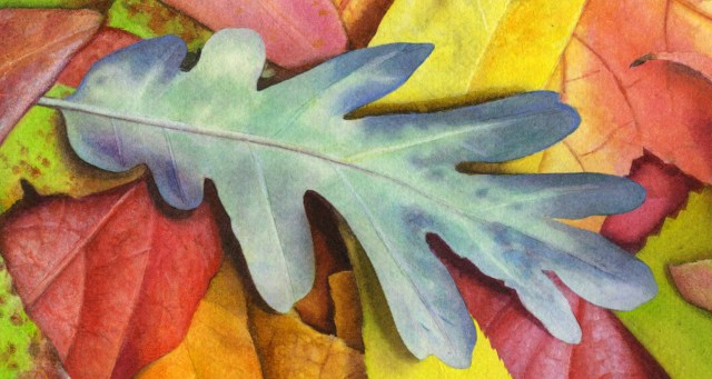 But I didn’t have to hunt too hard to find examples of the season. I ended up being very inspired by the bland ones, such as the oak leaves. Even though they weren’t initial standouts, their interesting bluish tones really enhanced my painting.