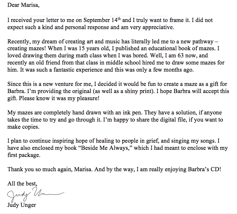 It was fun creating a maze for Barbra Streisand. I sent it to my new contact at her foundation and I share my letter that went along with it.