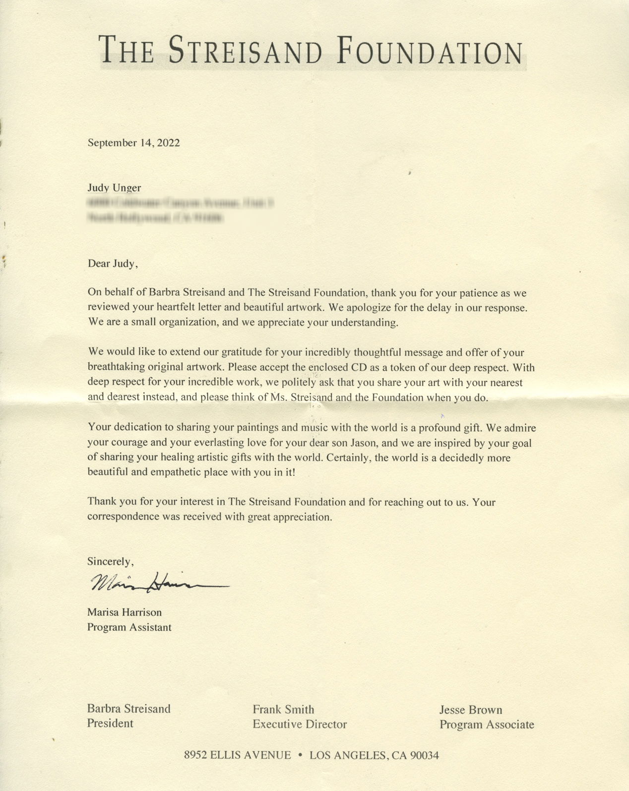 “Your dedication to sharing your paintings and music with the world is a profound gift. We admire your courage and your everlasting love for your dear son Jason, and we are inspired by your goal of sharing your healing artistic gifts with the world. Certainly, the world is a decidedly more beautiful and empathetic place with you in it!”