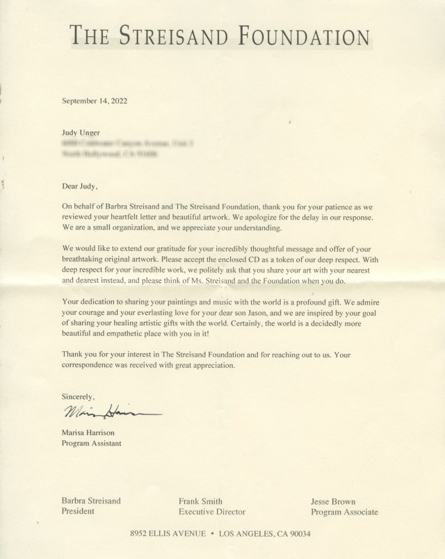 When I received a letter back from the Streisand foundation, I was floored! It was such an unbelievably beautiful letter that I wanted to frame it.