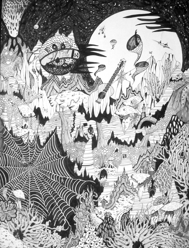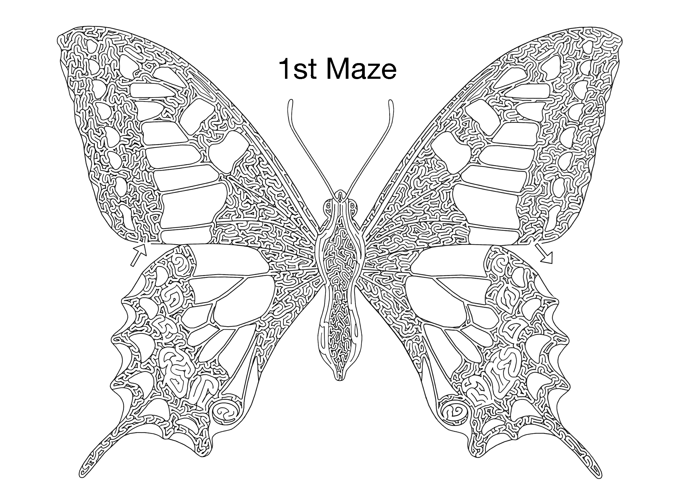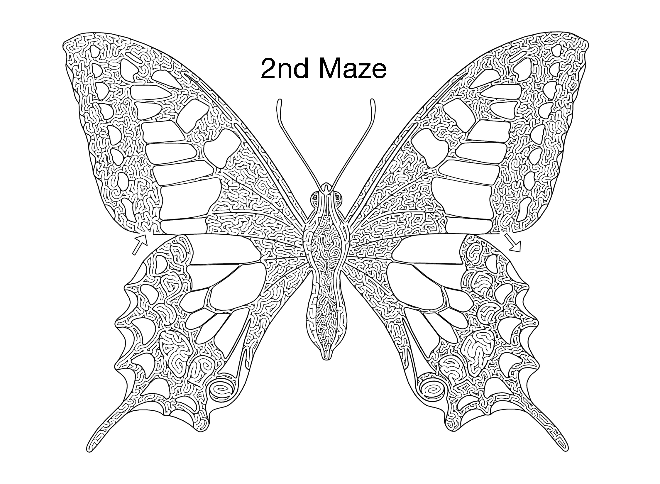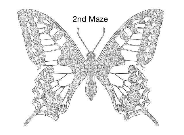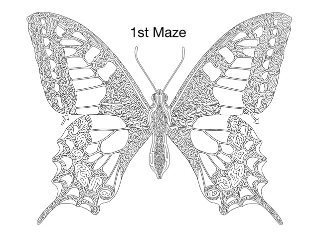 I drew my butterfly maze twice, because initially I wasn’t satisfied with the first version. I ended up finding charm with both of them. The second maze was slightly more realistic, with more pronounced lines on the wings and less parallel spot separation lines.