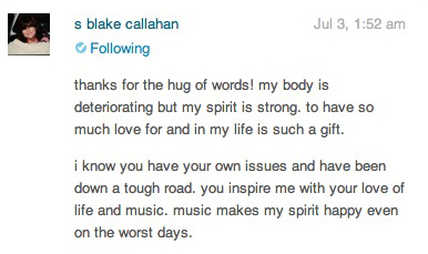 This is a recent message from my cyber friend, Sandra Callahan, who is dying.