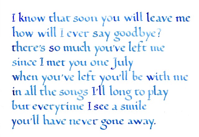Confronting an impending loss seems to require a stiff upper lip and denying tears is very common. I changed the line “Since I met you one July” into “I’ll try hard not to cry” and it became deeply honest and moving for me.