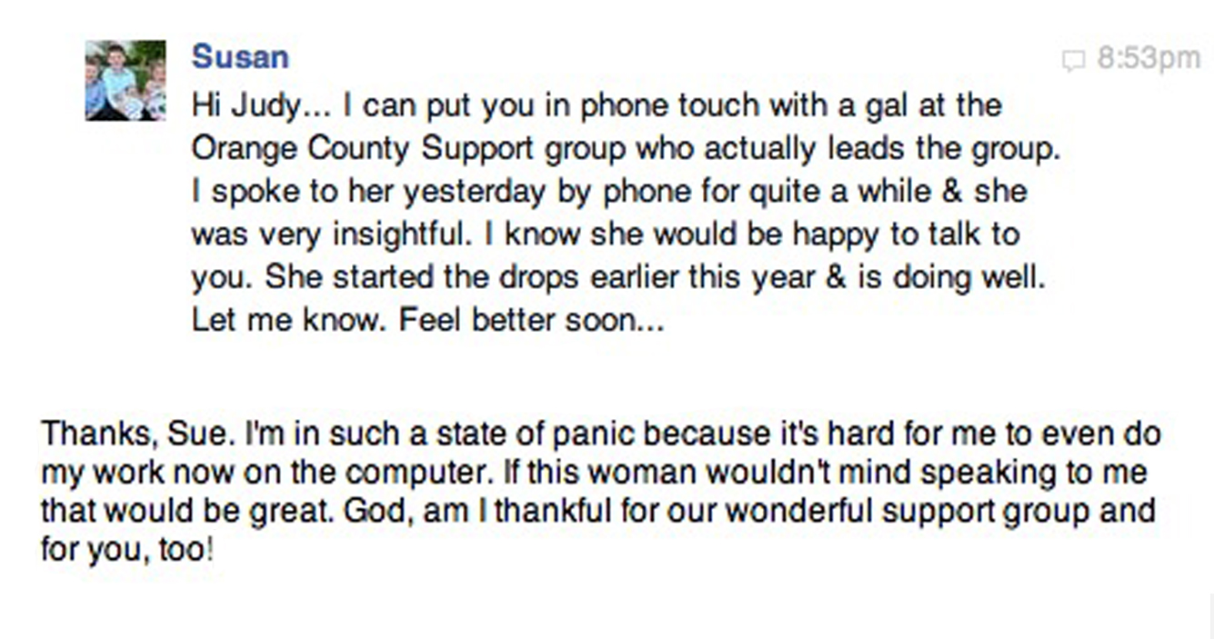 Only the week before, I had gone to my hypnotherapy appointment with a stack of pages related to dry eyes. I told Connie (my hypnotherapist) they were sent to me by a wonderful woman who had reached out to me. Her name was Judi, and she was the leader of a dry eye support group. I wished her group meetings were closer because unfortunately the group met about 2 hours away from where I lived.