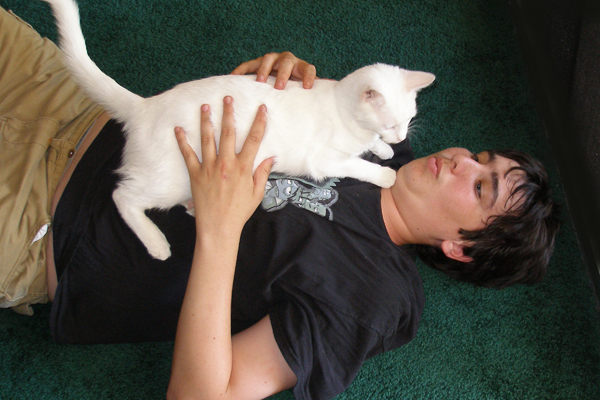 My oldest son with his white cat, Sky – I call him “The one that throws up all the time”