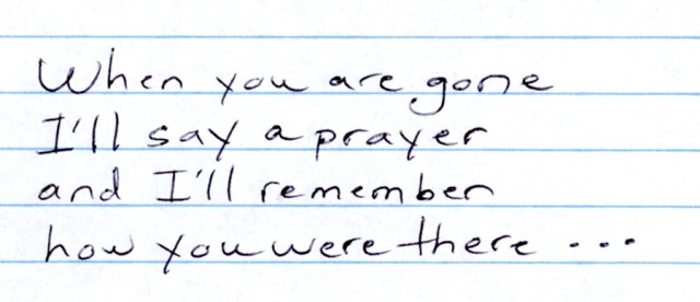 My song wasn’t finished until the last line fell into place. Initially, I wrote these words: “When you’re not there, I’ll look for your love everywhere.”